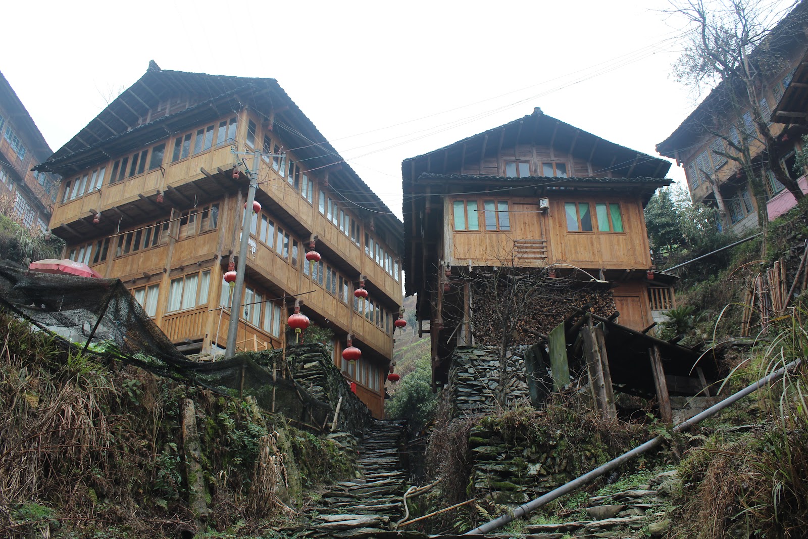 In the morning we went to the big local market where we were exposed to our first cat and dog meat sales. It's pretty common to hear the stereotype that you'll be fed cat meat in China and that Chinese people like to eat dog but I didn't really think it was that true. At this market though there were dead cats and dogs skinned and hanging on hooks to bleed out. Guys were chopping through dogs skulls with big cleavers and popping out their eyeballs. The worst thing though was that their were live dogs and cats squished together in cages all shaking in fear. Must be pretty rough to be sitting right there watching your buds get skinned and chopped up. The dead dogs were laid on top of the live dogs cage and they were getting covered in blood and licking at the dead dogs above them. It was super grusome and I thought beforehand it would be interesting to see but I just felt really weird and gross so we had to get the fuck outta there. Neither of us were too inclined to eat meat for a couple days after that. Out last excursion in Yangshou was to the rice terraces near the city. They are the rice fields carved up the sides of mountains and you get to hike to the top to overlook the villages and rice fields of the surrounding villages. On the way we stopped at this long-haired village where the women don't cut their hair for their entire lives. They had a play/dance show to teach what their culture was all about and I got selected to participate from the crowd in front of about 150 people. I had to wear a silly get-up and dance around with these women while they pinched my ass. Then they gave me a mic and told me I had to sing a love song in front of everyone...most embarrassing shit ever. Afterwards a local news team interviewed me and informed me they filmed the whole thing so I may have wound up on Chinese television. The rice paddies themselves weren't so great due to the fog but the villages were cool and the hike was nice so all in all it was a good day trip...aside from being humiliated in front of a large audience.